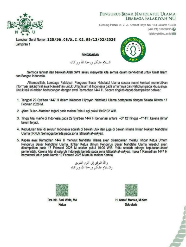 Sementara ketinggian hilal terkecil terjadi di Jayapura, Provinsi Papua dengan tinggi hilal mar’ie -3 derajat 12 menit. Adapun di titik Jakarta dengan markaz Gedung PBNU, Jalan Kramat Raya Jakarta Pusat (koordinat 6º 11’ 25” LS 106º 50’ 50” BT), tinggi hilal adalah -1 derajat 44 menit 39 detik dengan letak matahari terbenam pada 12 derajat 03 menit 24 detik selatan titik barat. Sementara ijtimak (konjungsi) terjadi pada Selasa Kliwon, 17 Februari 2026 M pukul 19:02:02 WIB.
